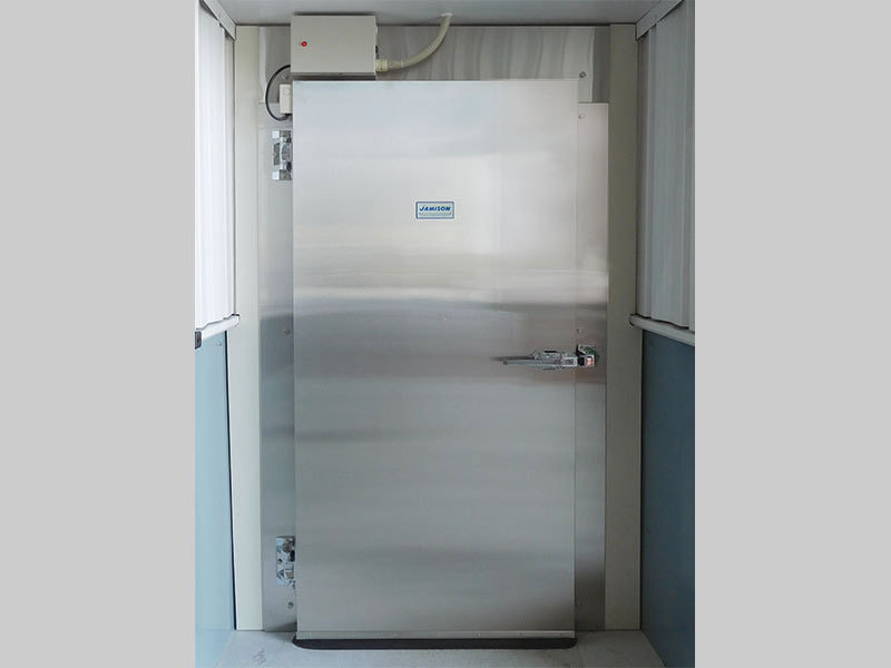 左右手前に開く2枚の扉を1つのファスナー金具でロックし、扉と化粧枠が重なる部分をパッキンで密着して断熱する形式の防熱扉です。ファスナー受けの有る側の扉は、トップラッチとフランス落シ金具(オプション)で固定も可能です。扉外周部にヒーターを設置することにより、扉の凍結を防止する事ができるため、冷凍庫にも対応が可能です。