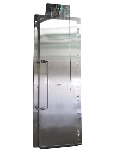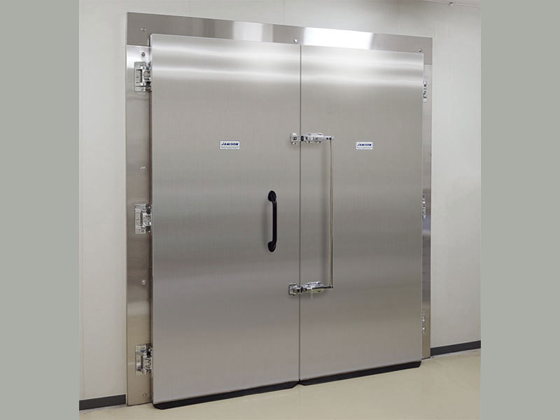 左右手前に開く2枚の扉を連動式ファスナー(2つのファスナーがバーで連結した大型両開き扉用金具)でロックし、扉と化粧枠が重なる部分をパッキンで密着して断熱する形式の防熱扉です。寸法が大きく重量も有るので、捻れ・吊り下がり等による扉開閉障害を防ぐため、蝶番の数を耐荷重性能に基づき設計しています。ファスナー受けの有る側の扉は、トップラッチとフランス落シ金具(オプション)で固定も可能です。扉外周部にヒーターを設置することにより、扉の凍結を防止する事ができるため、冷凍庫にも対応が可能です。